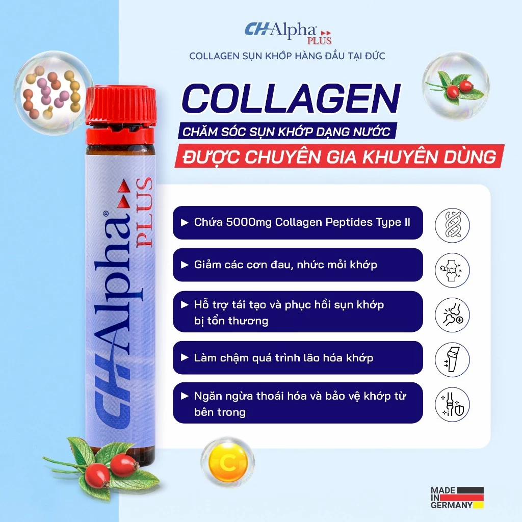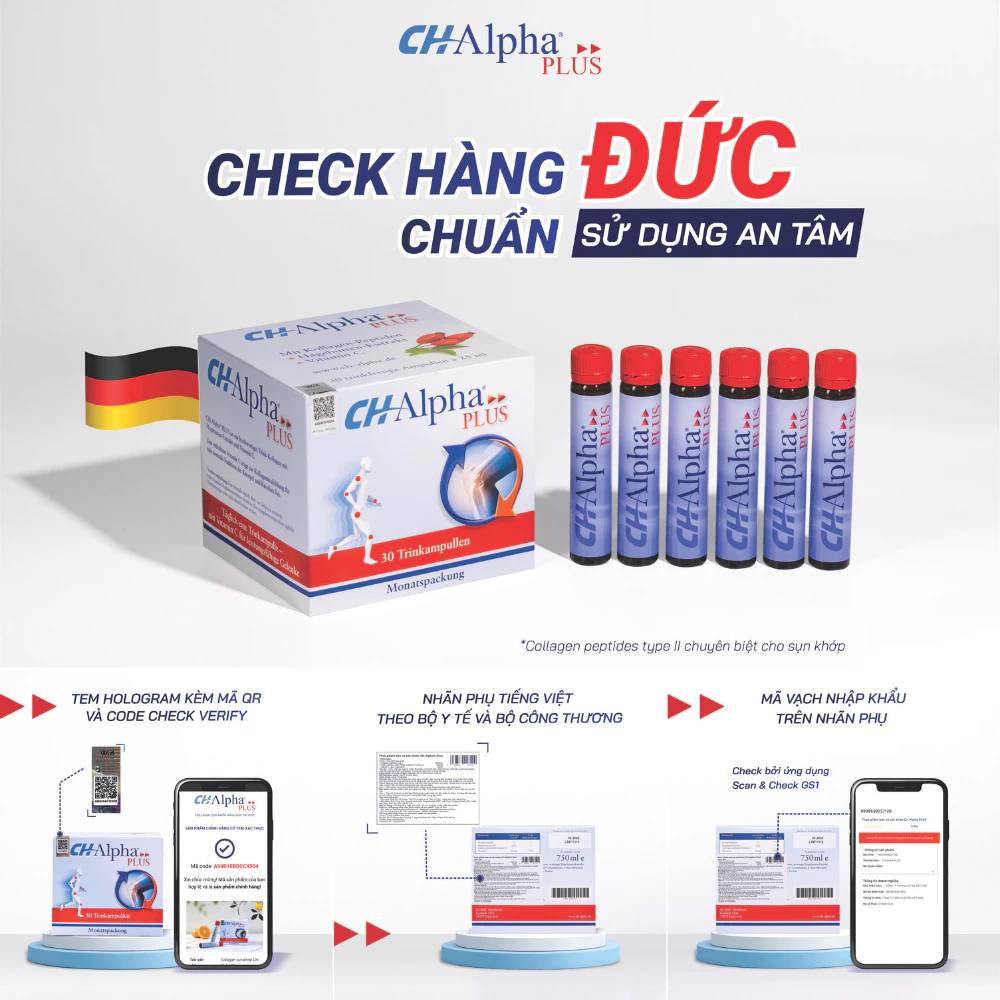 CH-Alpha PLUS là thực phẩm bảo vệ sức khỏe dành cho sụn khớp, được sản xuất và nhập khẩu trực tiếp từ Đức. Sản phẩm cung cấp công thức chuyên biệt chứa BCP (Bioactive Collagen Peptide) 5000mg, là dạng collagen thủy phân có hoạt tính sinh học cao, kết hợp cùng chiết xuất tầm xuân và Vitamin C, hỗ trợ dinh dưỡng cho sụn khớp, góp phần duy trì hệ vận động linh hoạt.