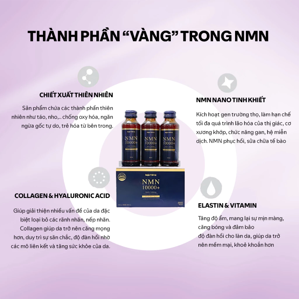 - Công thức toàn diện: Kết hợp NMN hàm lượng cao cùng bộ ba “Collagen – HA – Elastin”.