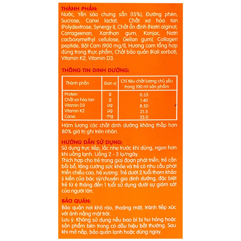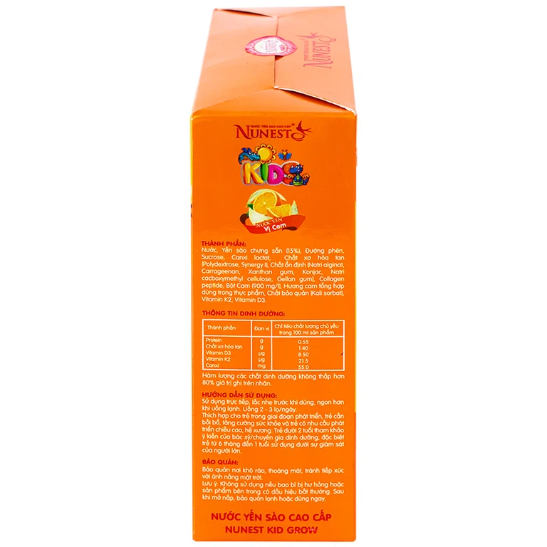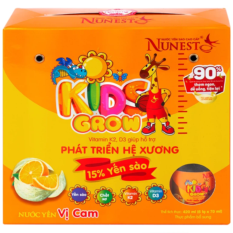 Nước yến sào cao cấp cho trẻ em Nunest Kid Grow vị cam là sản phẩm kết hợp giữa yến sào thiên nhiên từ Khánh Hòa, Ninh Thuận cùng chiết xuất cam tự nhiên và các dưỡng chất bổ dưỡng. Sản phẩm giúp bồi bổ cơ thể, tăng cường sức khỏe và hỗ trợ phát triển hệ xương của trẻ.