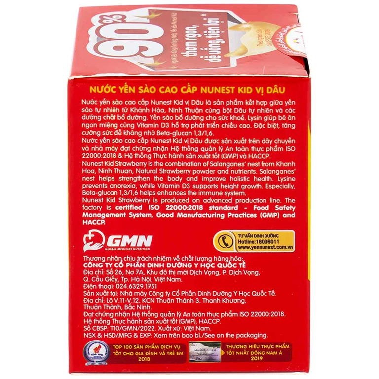 Nước yến sào cao cấp cho trẻ em Nunest Kid vị dâu là sản phẩm của thương hiệu Yến sào Nunest , thuộc Công ty Cổ phần Dinh dưỡng Y học Quốc tế (Global Medicine Nutrition). Nunest cam kết mang đến: