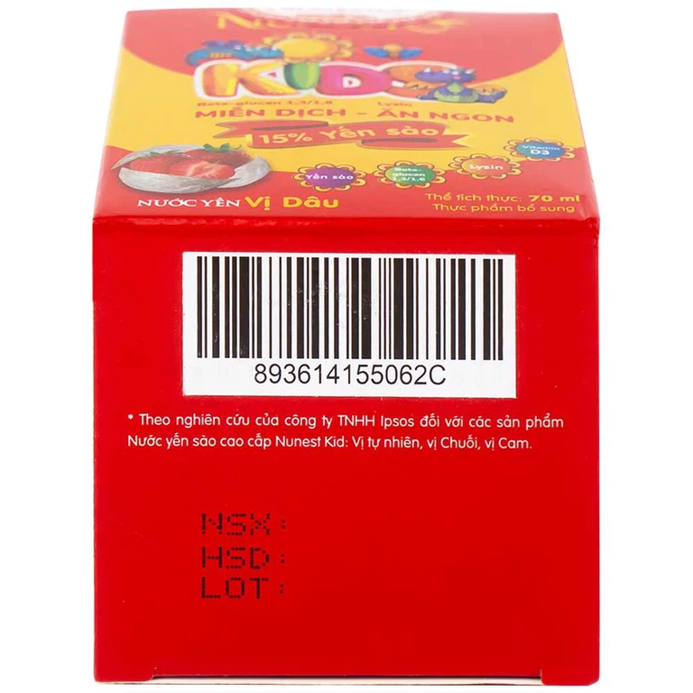 Nước yến sào cao cấp cho trẻ em Nunest Kid vị dâu không những chứa tổ yến tự nhiên mà còn giúp trẻ bổ sung thêm beta glucan, lysine và vitamin D3. Trẻ được bồi bổ, ăn ngon và tăng cường sức khỏe để chống lại bệnh tật.