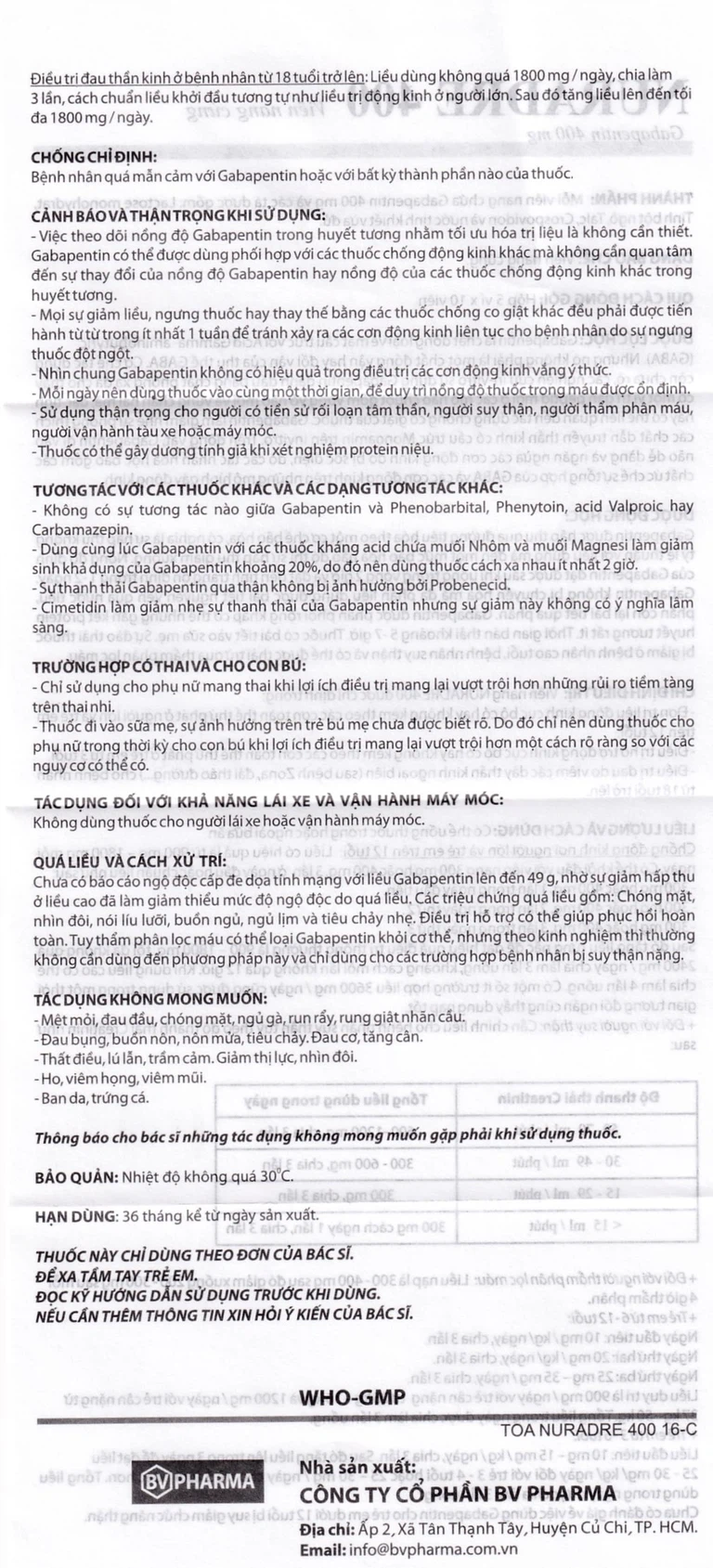 Điều trị đau thần kinh ở bệnh nhân từ 18 tuổi trở lên: Liều dùng không quá 1800mg/ngày, chia làm 3 lần, cách chuẩn liều khởi đầu tương tự như liều trị động kinh ở người lớn. Sau đó tăng liều lên đến tối đa 1800mg/ngày.