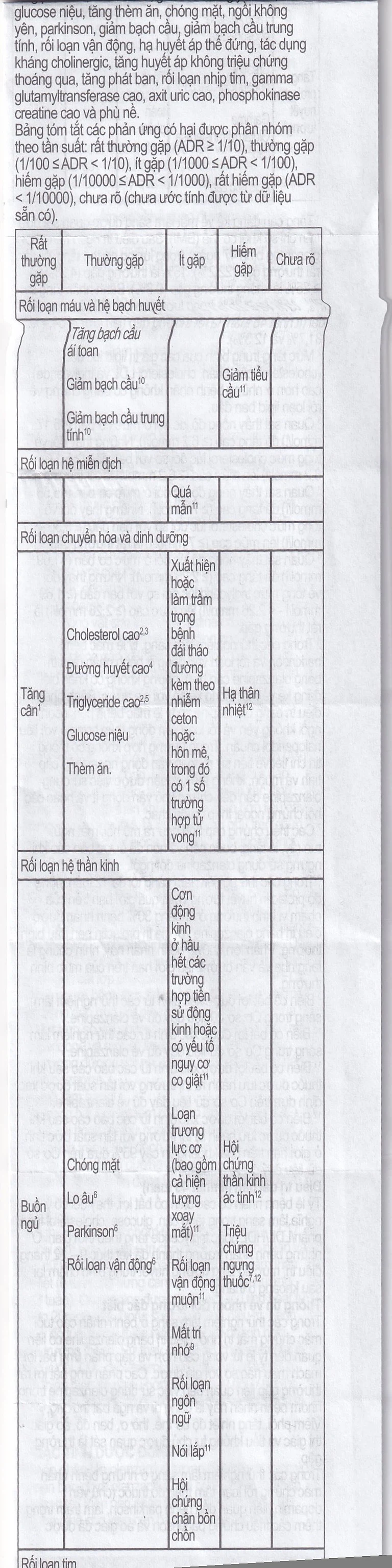 Trong suốt quá trình điều trị, bệnh nhân ở độ tuổi thanh thiếu niên tăng cân nhanh hơn người trưởng thành. Sự thay đổi chỉ số cholesterol toàn phần lúc đói, LDL cholesterol, triglycerid và prolactin ở thanh thiếu niên thì nhiều hơn so với thay đổi ở người trưởng thành. Không có dữ liệu hiệu quả và an toàn khi điều trị lâu dài.
