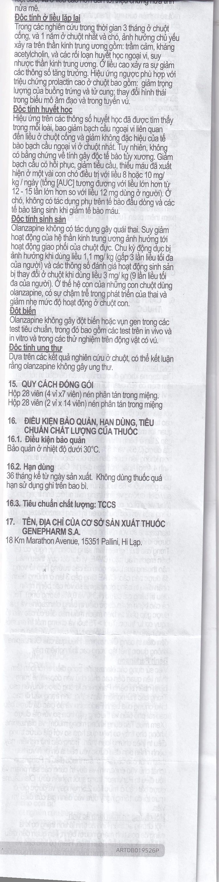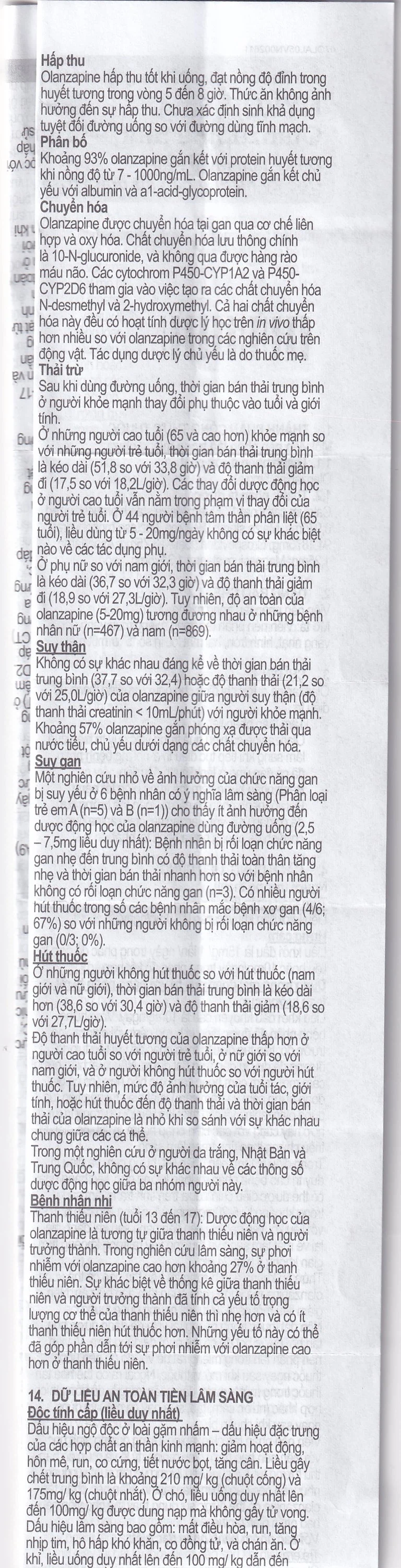 Suy thận: Không có sự khác nhau đáng kể về thời gian bán thải trung bình (37,7 so với 32,4) hoặc độ thanh thải (21,2 so với 25,0L/giờ) của olanzapine giữa người suy thận (độ thanh thải creatinin < 10mL/phút) với người khỏe mạnh. Khoảng 57% olanzapine gắn phóng xạ được thải qua nước tiểu, chủ yếu dưới dạng các chất chuyển hóa.
