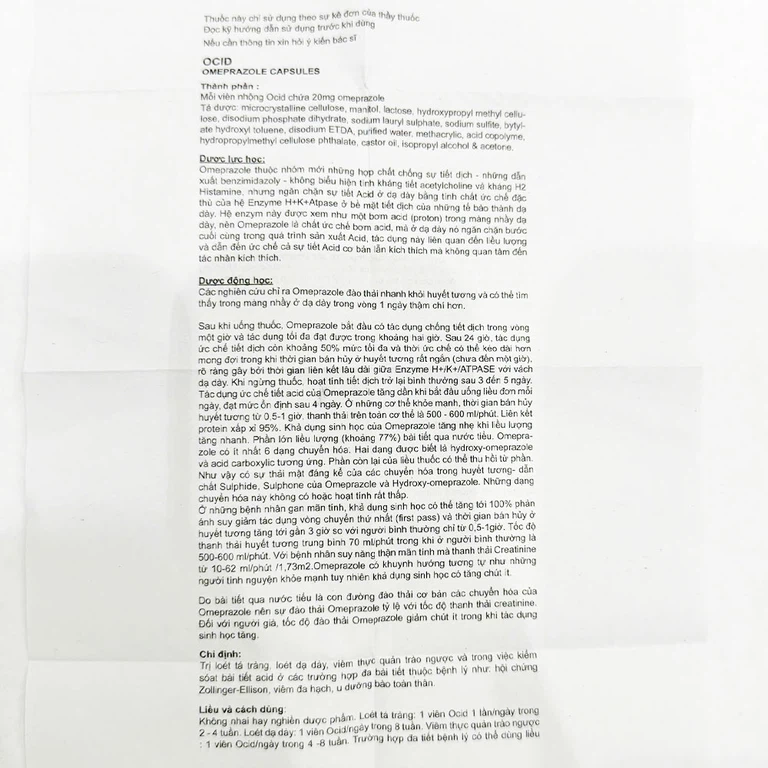 Loét dạ dày: 1 viên Ocid/ngày trong 8 tuần. Viêm thực quản trào ngược: 1 viên Ocid/ngày trong 4 – 8 tuần. Trường hợp đa tiết bệnh lý có thể dùng liều 60mg Ocid uống 1 lần/ngày và phải liên tục theo sự chỉ dẫn của bác sĩ.