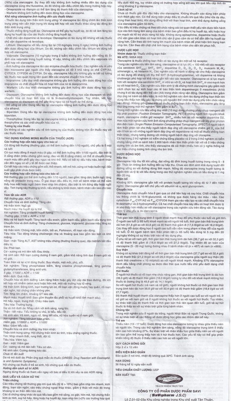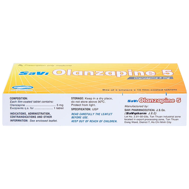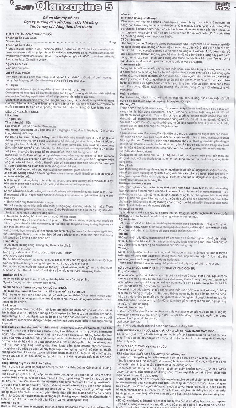 Olanzapine 5 được sản xuất bởi Công ty Cổ phần Dược phẩm Savi, với thành phần chính olanzapine. Đây là thuốc dùng để điều trị bệnh tâm thần phân liệt, duy trì cải thiện tình trạng lâm sàng khi tiếp tục điều trị bằng olanzapine ở những người bệnh đã có đáp ứng với lần điều trị đầu tiên. Thuốc còn được dùng trong điều trị giai đoạn hưng cảm mức độ trung bình và nặng. Ở những bệnh nhân có giai đoạn hưng cảm đáp ứng tốt với điều trị bằng olanzapine, thuốc còn được chỉ định để dự phòng tái phát trên bệnh nhân có rối loạn lưỡng cực.