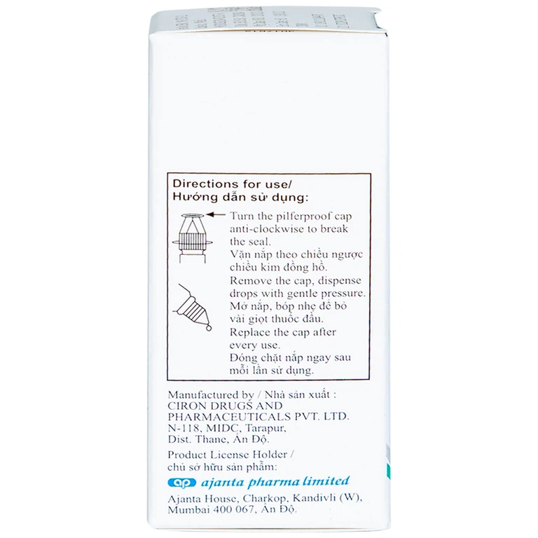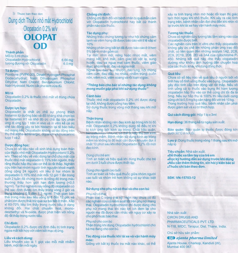 Olopat Od Ajanta 3Ml của công ty Ciron Drugs And Pharmaceuticals Pvt. Ltd, thành phần chính là olopatadin hydrochlorid, thuốc dùng để điều trị tình trạng ngứa mắt kết hợp với viêm kết mạc dị ứng theo mùa.
