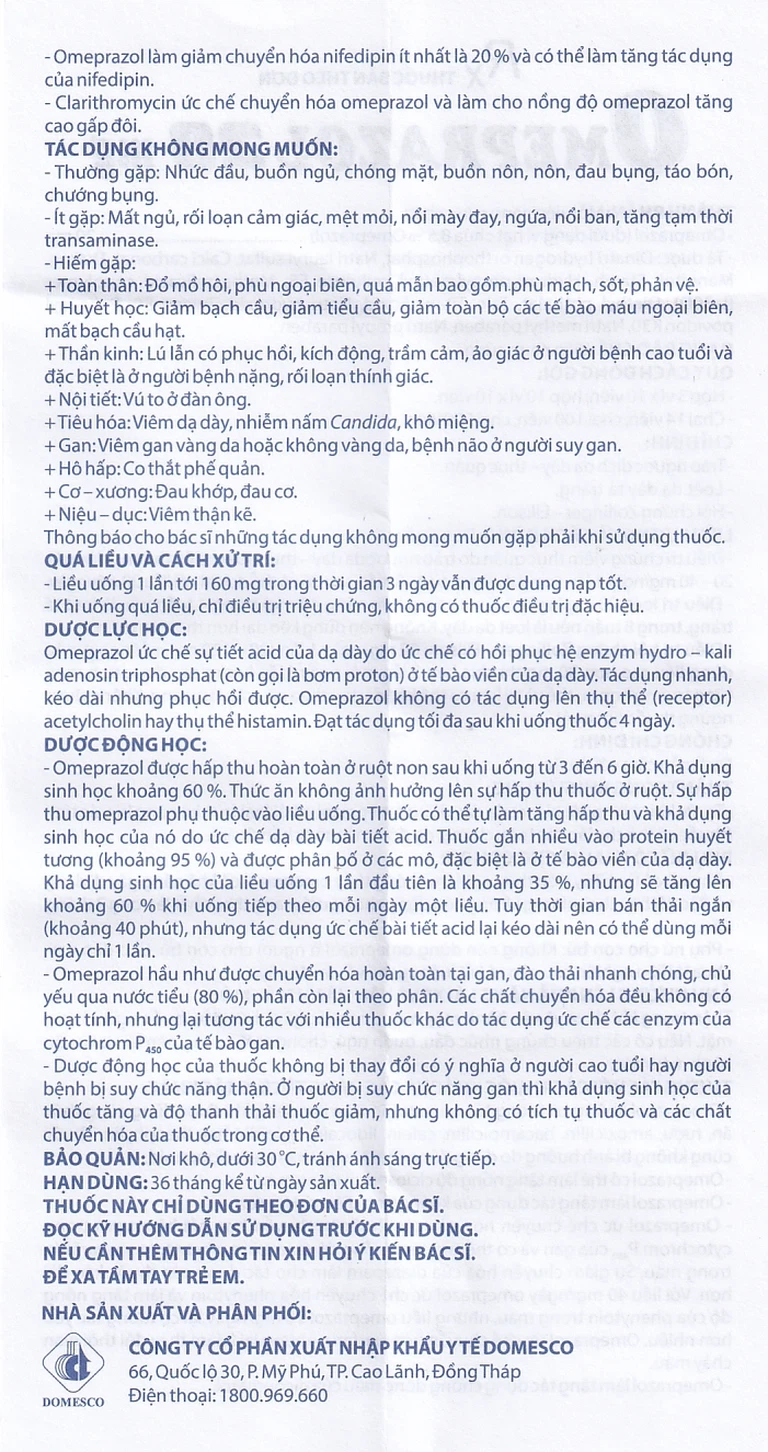 Chuyển hóa: Omeprazol hầu như được chuyển hóa hoàn toàn ở gan, chủ yếu nhờ isoenzym CYP2C19 của cytochrom P450 và một phần nhỏ chuyển hóa qua CYP3A4.