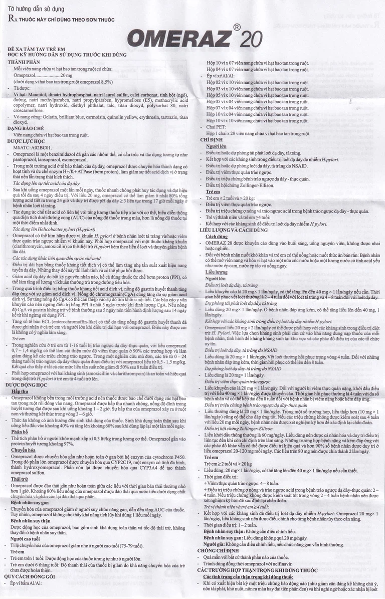 Omeprazol liều 20mg x 2 lần/ngày có thể được phối hợp với các kháng sinh trong điều trị diệt trừ H. Pylori. Việc lựa chọn kháng sinh phải căn cứ vào khả năng dung nạp thuốc của mỗi bệnh nhân, tình hình đề kháng kháng sinh tại khu vực và các phác đồ điều trị của các tổ chức uy tín.