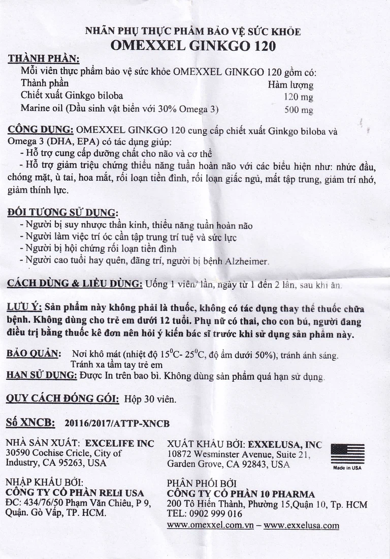 Viên uống Omexxel Ginkgo 120 ExxelUSA hỗ trợ cung cấp dưỡng chất cho não và cơ thể (3 vỉ x 10 viên)
