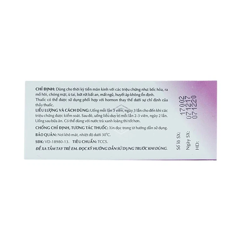 - Dùng cho thời kỳ tiền mãn kinh với các triệu chứng như: Bốc hoả, ra mồ hôi, chóng mặt, ù tai , bứt rứt bất an, mất ngủ, huyết áp không ổn định.