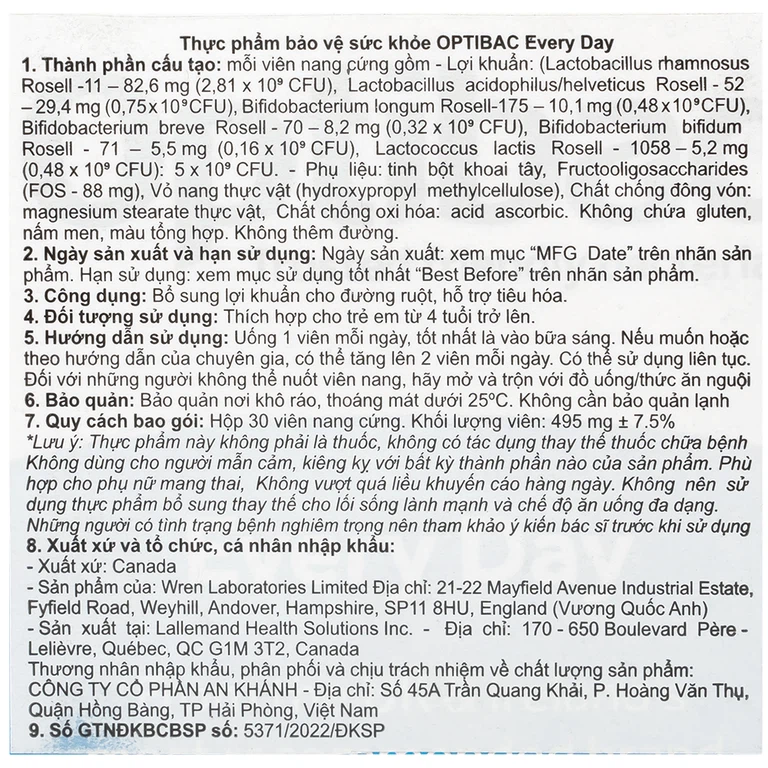 Optibac Every Day bổ sung lợi khuẩn cho đường ruột, hỗ trợ tiêu hóa.