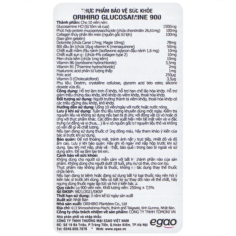 Orihiro Glucosamine 900 chứa các thành phần hỗ trợ xương và sụn như phức hợp protein mucopolysacarit (chondroitin) và chất phân giải collagen lên men.
