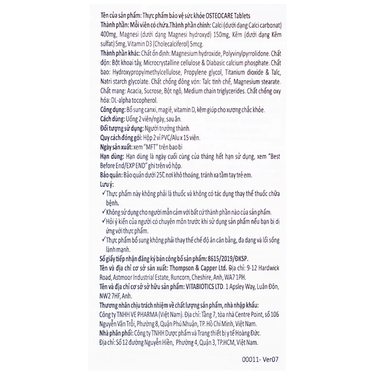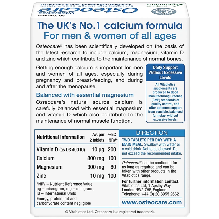 Osteocare là công thức chăm sóc xương được yêu thích ở Anh. Sản phẩm cung cấp nguồn calci tự nhiên, cân bằng tỉ lệ với magiê, vitamin D và kẽm, tất cả đều góp phần duy trì xương bình thường. Sản phẩm cần thiết cho cả cho nam giới và phụ nữ tuổi trưởng thành. Osteocare được nghiên cứu và phát triển bởi một trong những tập đoàn dược phẩm lớn mạnh nhất nhì tại nước Anh là Vitabiotics.