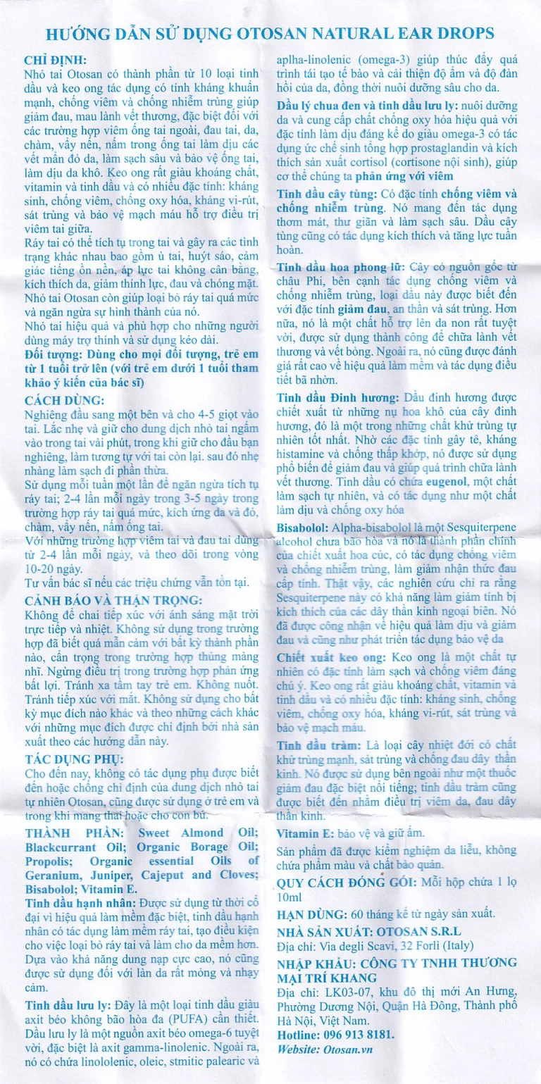Otosan Natural Ears Drops là dung dịch nhỏ tai đảm bảo giữ vệ sinh cho tai, chống ẩm và cân bằng lại vi sinh vật tự nhiên trong tai. Sản phẩm được dùng cho các trường hợp viêm tai giữa và đau tai; viêm da, chàm, vẩy nến, nấm trong ống tai; khô bong tróc da trong ống tai, bỏng rát, viêm và ửng đỏ ở bên ngoài và tai ngoài.
