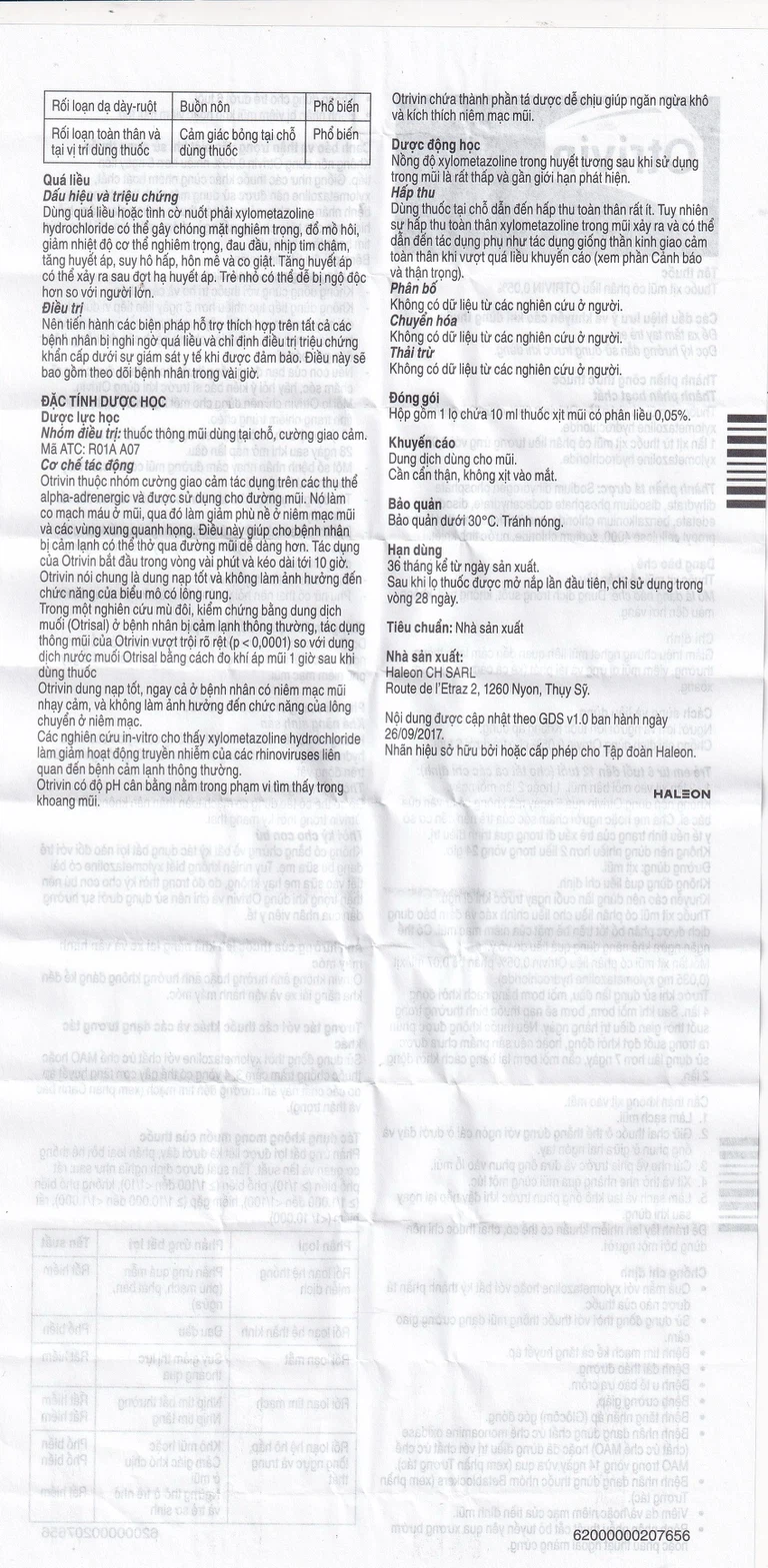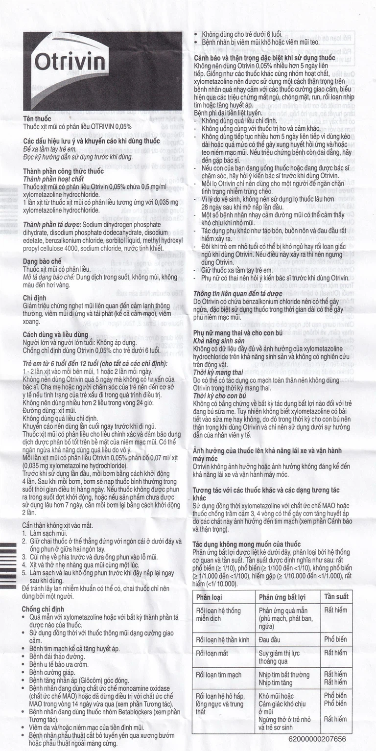 Mỗi lần xịt mũi có phân liều Otrivin 0,05% phân bố 0,07 ml/ xịt (0,035 mg xylometazoline hydrochloride).