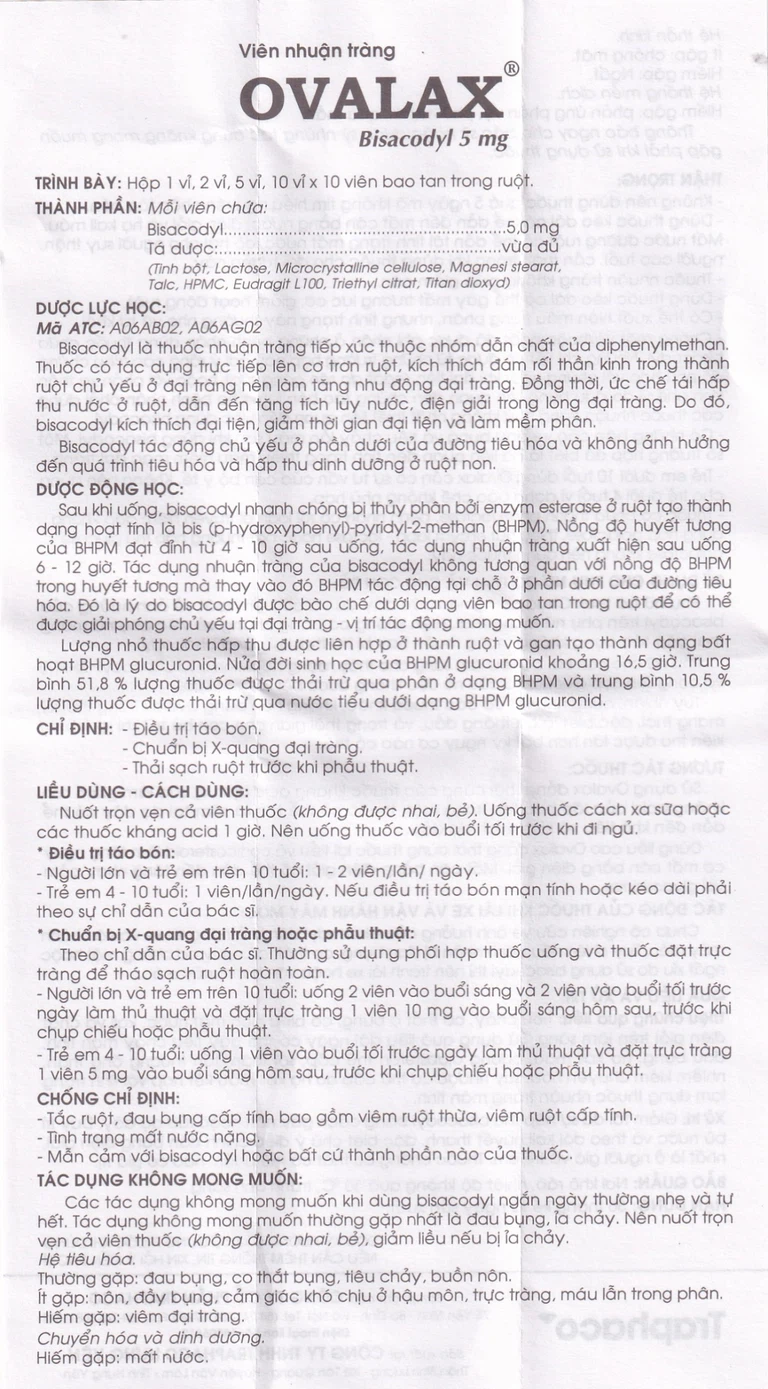 Thuốc Ovalax® do Công ty Cổ phần Traphaco sản xuất, có thành phần chính là Bisacodyl, chất nhuận tràng. Thuốc Ovalax được chỉ định trong điều trị táo bón, chuẩn bị chụp X-quang đại tràng, thải sạch ruột trước khi phẫu thuật.