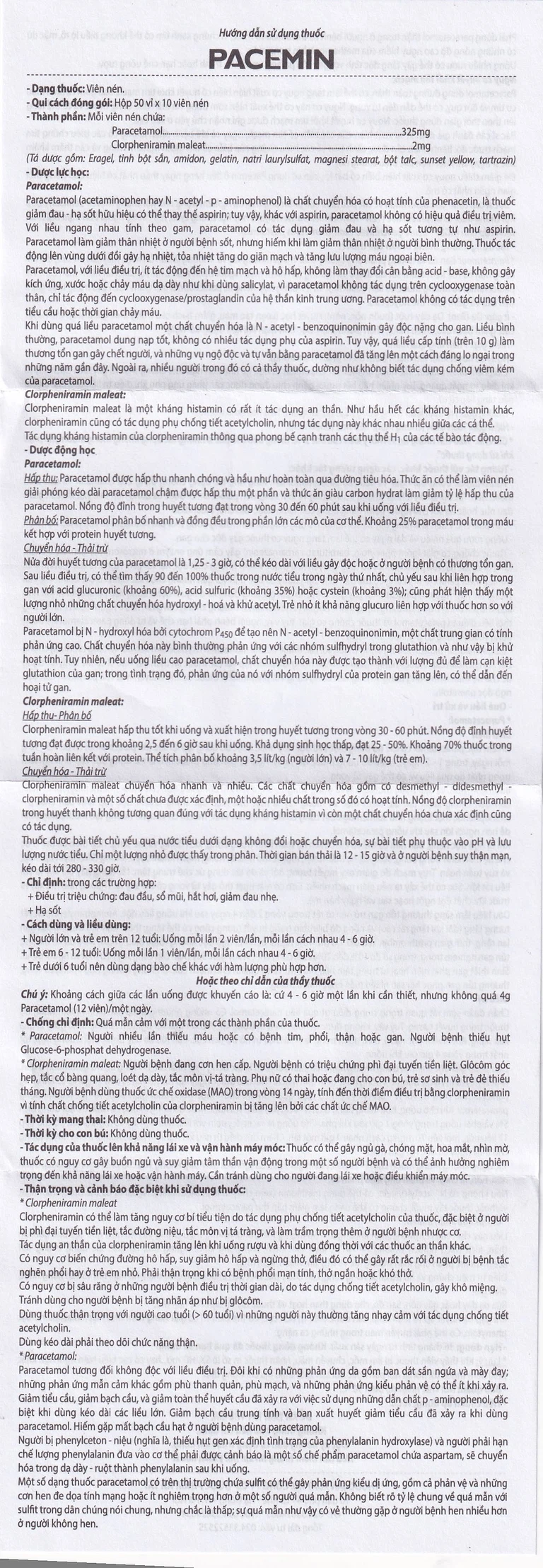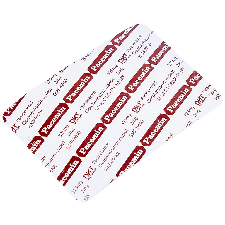 Pacemin của Công ty CP dược phẩm Hà Tây, có thành phần là paracetamol (325 mg), clorpheniramin maleat (2 mg). Thuốc được dùng trong điều trị triệu chứng đau đầu, sổ mũi, hắt hơi, giảm đau nhẹ, hạ sốt.