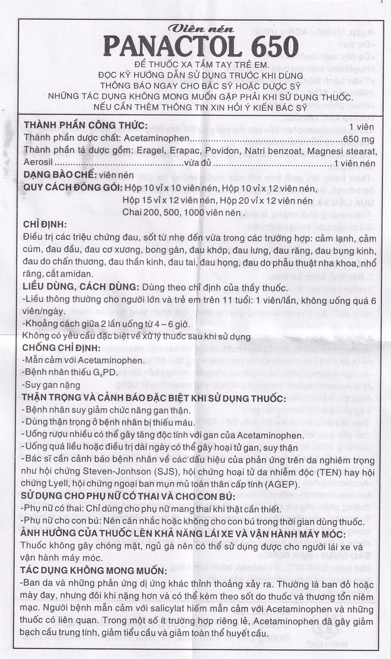 Cách dùng Viên nén Panactol 650mg