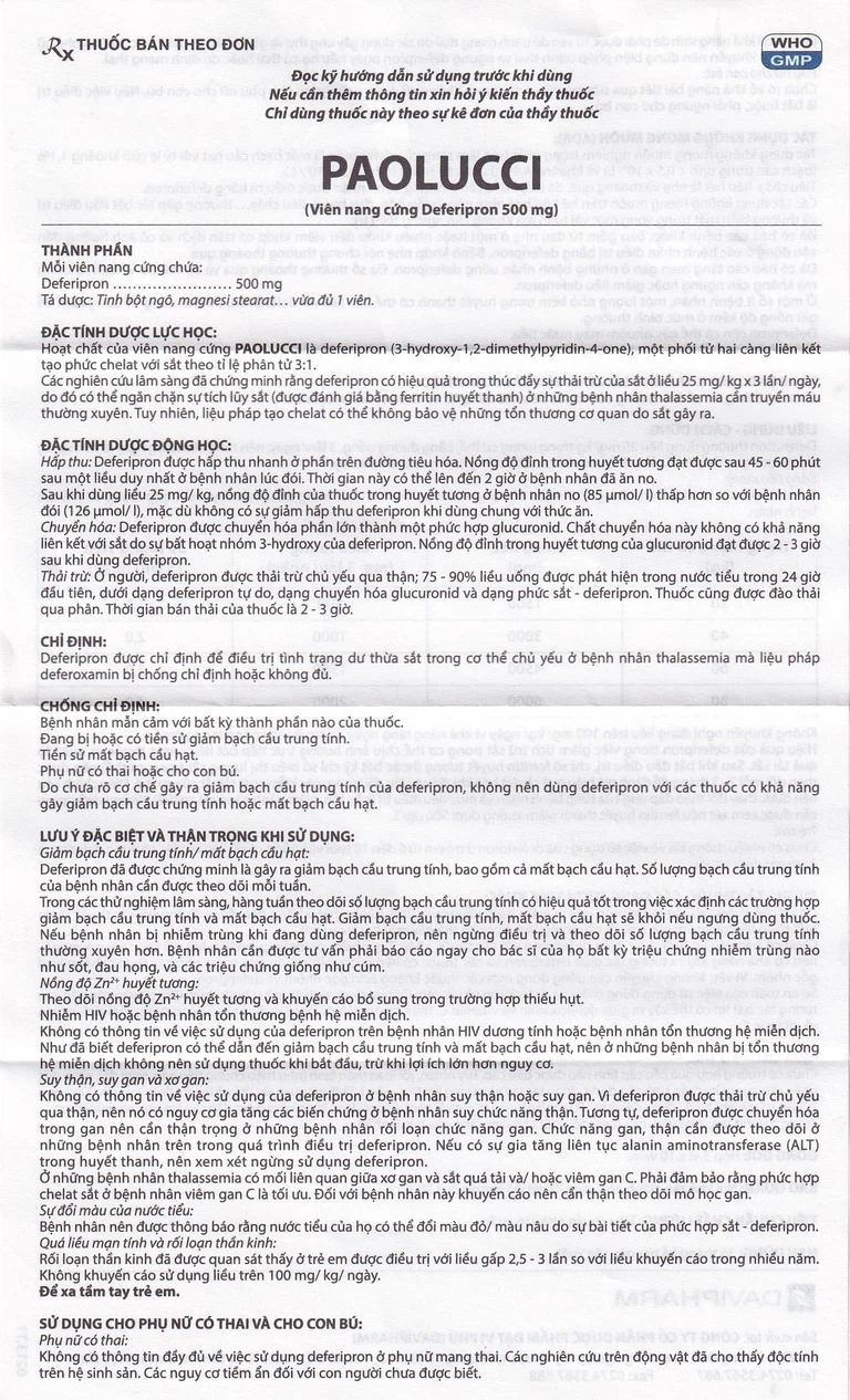 Hoạt chất của viên nang cứng Paoluci là deferipron, một phối tử hai càng liên kết tạo phức chelat với sắt theo tỉ lệ phân tử 3:1.