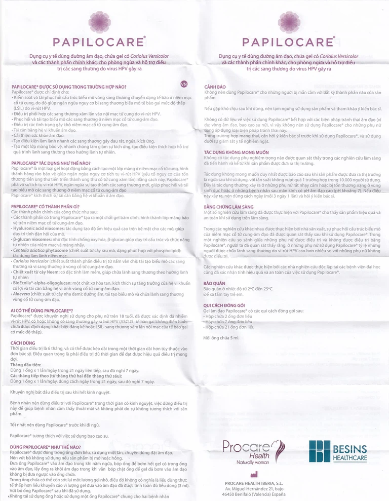 - Mỗi ngày 1 ống Papilocare đặt âm đạo, vào buổi tối trước khi đi ngủ. Nên bắt đầu điều trị sau khi sạch kinh nguyệt.