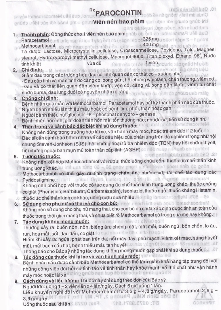 Parocotin với sự kết hợp giữa Methocarbamol và Paracetamol nên có tác dụng ức chế thần kinh dẫn truyền cảm giác đau hoặc ức chế dẫn truyền cảm giác đau đến não trong các trường hợp đau liên quan đến co thắt cơ – xương.