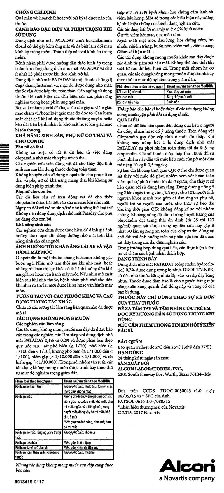 Dung dịch nhỏ mắt Pataday chứa benzalkonium clorid có thể gây kích ứng mắt và đã biết làm đổi màu kính áp tròng mềm. Tránh tiếp xúc với kính áp tròng mềm.