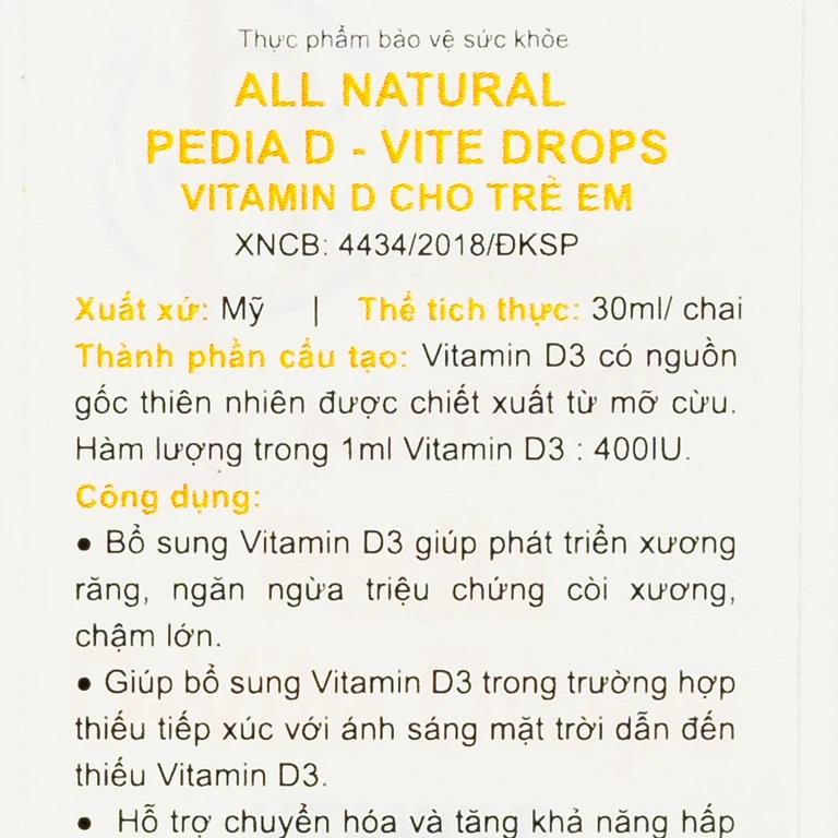 Pedia D-Vite Drops cung cấp đủ 400IU vitamin D trong ngày cho bé theo khuyến cáo của Viện hàn lâm nhi khoa Mỹ giúp xương và răng chắc khỏe. Hỗ trợ tăng khả năng hấp thu canxi và các trường hợp thiếu vitamin D, còi xương, suy dinh dưỡng thấp còi…
