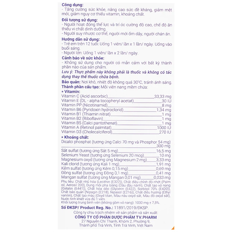 Viên uống Phariton TVP được tổng hợp từ các vitamin và khoáng chất thiết yếu, giúp phục hồi sức khỏe cho người mới ốm dậy, sau khi phẫu thuật, người lớn tuổi. Sản phẩm đến từ thương hiệu TV.Pharm và được sản xuất trực tiếp tại Việt Nam.