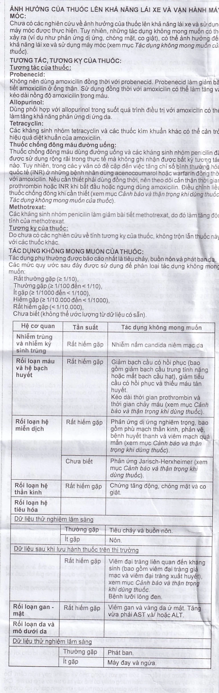 Thuốc chống đông máu đường uống: Thuốc chống đông máu dùng đường uống và các kháng sinh nhóm penicillin đã được sử dụng rộng rãi trong thực tế mà không ghi nhận được bất kỳ tương tác nào. Tuy nhiên, trong các y văn có đề cập đến việc tăng chỉ số bình thường hoá quốc tế (INR) ở những bệnh nhân dùng acenocoumarol hoặc warfarin đồng thời với amoxicillin. Nếu cần thiết phải dùng đồng thời, nên theo dõi cẩn thận thời gian prothrombin hoặc INR khi bắt đầu hoặc ngưng dùng amoxicillin. Điều chỉnh liều thuốc chống đông khi cần thiết.