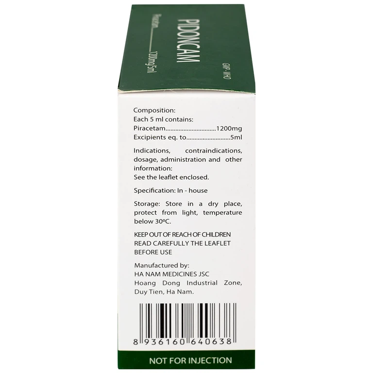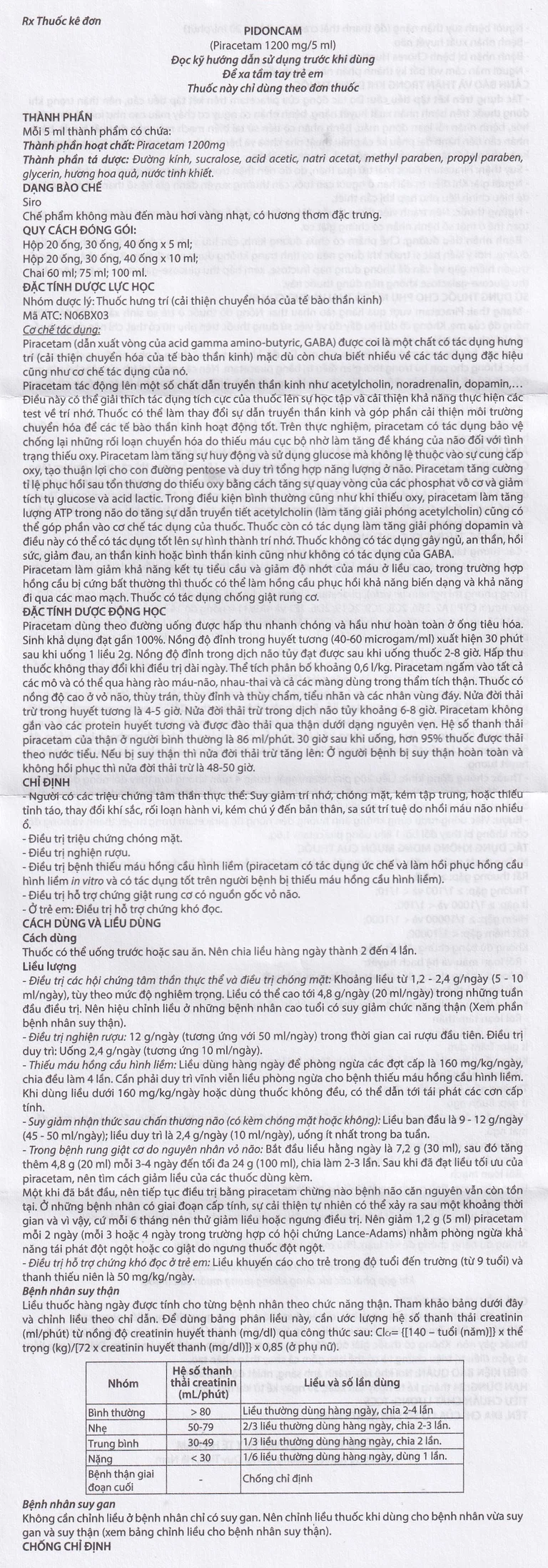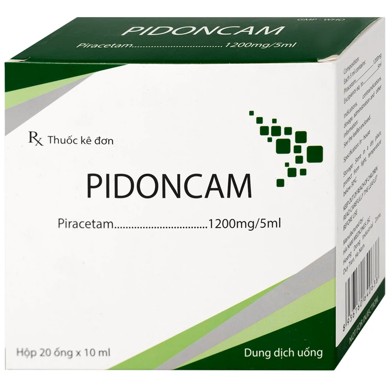 Thuốc Pidoncam là dung dịch uống chứa hoạt chất Piracetam dùng điều trị triệu chứng chóng mặt, nghiện rượu. Điều trị bệnh thiếu máu hồng cầu hình liềm, điều trị hỗ trợ chứng giật rung cơ có nguồn gốc vỏ não.