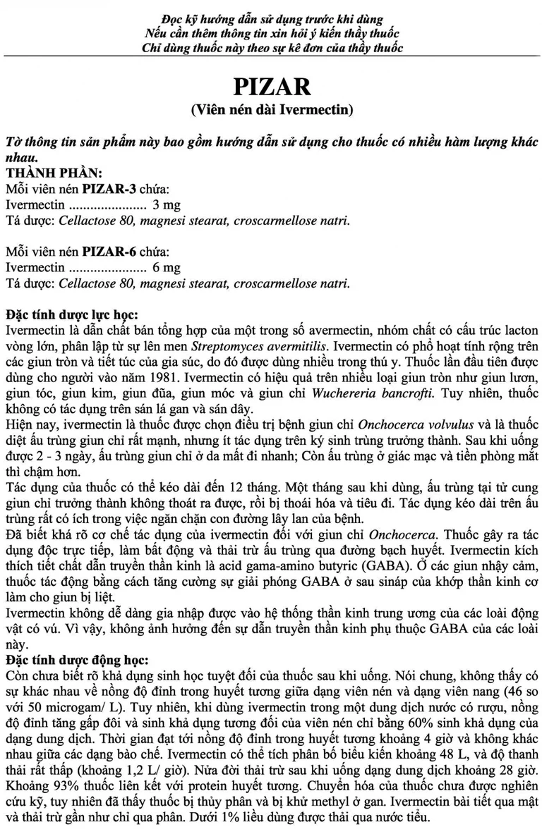 Pizar 3 của Công ty cổ phần Dược Đạt Vi Phú, hoạt chất chính là ivermectin, là một loại thuốc chống ký sinh trùng. Ivermectin được sử dụng để điều trị các bệnh nhiễm trùng trong cơ thể do một số loại ký sinh trùng gây ra.
