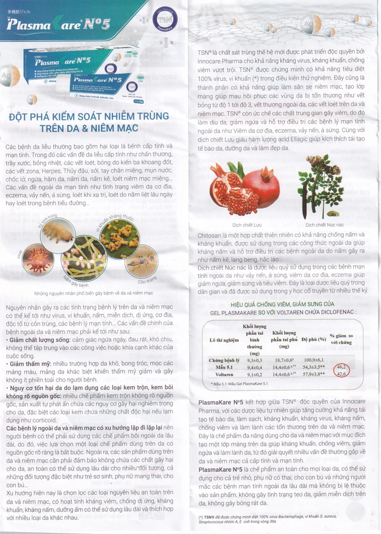 TSN trong Plasmakare Nº5 còn có tác dụng làm săn se niêm mạc, đồng thời tạo một lớp màng bảo vệ, giúp đẩy nhanh quá trình phục hồi các vùng da bị tổn thương. Thành phần này đặc biệt hữu ích trong việc hỗ trợ chữa lành các vết thương do Zona, Herpes, thủy đậu, tay chân miệng,…