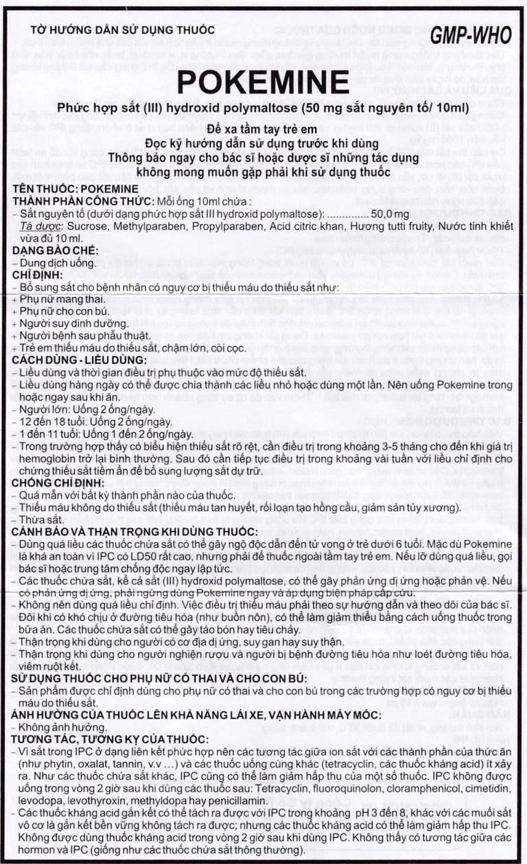 Pokemine do Công ty Cổ Phần Dược Phẩm MEDISUN có chứa Sắt nguyên tố (dưới dạng phức hợp sắt III hydroxid polymaltose) 50 mg dạng dung dịch uống 10 ml với công dụng bổ sung sắt cho bệnh nhân có nguy cơ bị thiếu máu do thiếu sắt như: Phụ nữ mang thai, phụ nữ cho con bú, người suy dinh dưỡng, người bệnh sau phẫu thuật, trẻ em thiếu máu do thiếu sắt, chậm lớn, còi cọc.