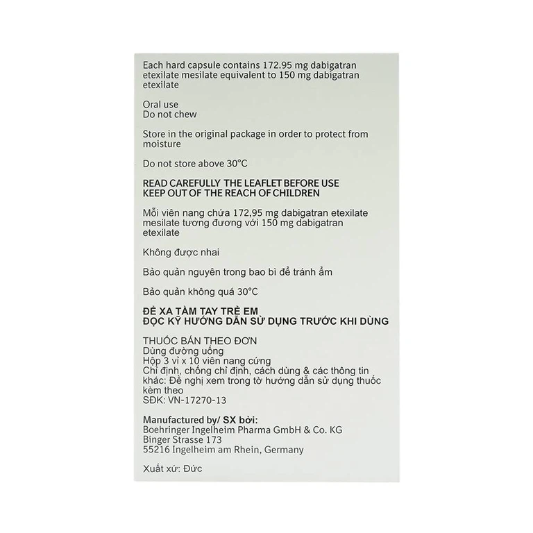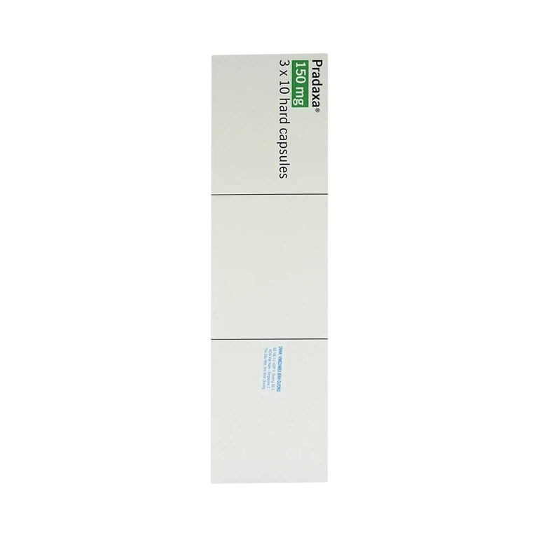 Pradaxa 150 mg sản xuất bởi Boehringer Ingelheim Pharma GmbH & Co. KG (Đức), được chỉ định trong phòng ngừa tai biến thuyên tắc huyết khối tĩnh mạch, phòng ngừa đột quỵ, điều trị huyết khối tĩnh mạch sâu cấp và/hoặc thuyên tắc phổi, giảm nguy cơ tái phát huyết khối tĩnh mạch sâu và thuyên tắc phổi.