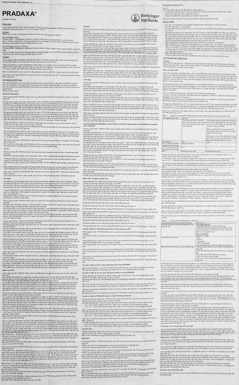 - Giảm nguy cơ tái phát huyết khối tĩnh mạch sâu (DVT) và thuyên tắc phổi (PE) ở những bệnh nhân đã được điều trị trước đó: Liều khuyến cáo hàng ngày của PRADAXA là 300 mg, dùng đường uống với viên nang cứng 150mg hai lần mỗi ngày. Điều trị có thể kéo dài tuỳ thuộc vào nguy cơ của từng bệnh nhân.