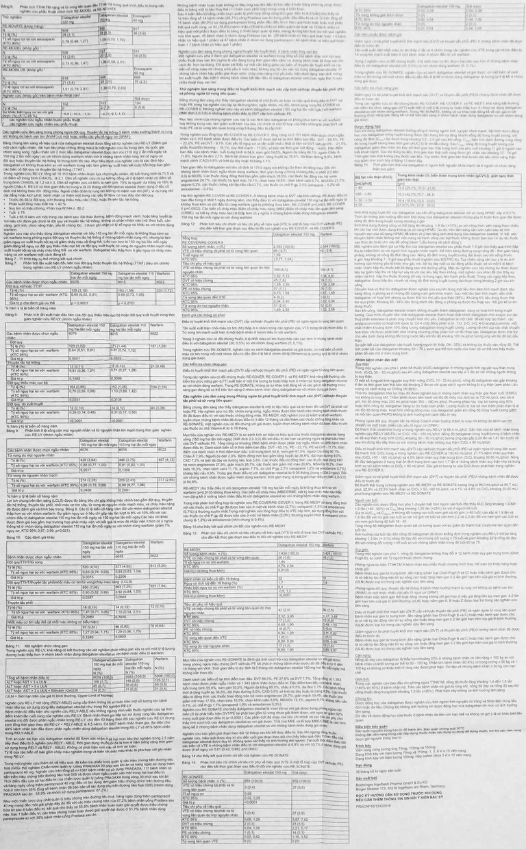 - Điều trị huyết khối tĩnh mạch sâu (DVT) cấp và/hoặc thuyên tắc phổi (PE) và ngăn ngừa tử vong liên quan: Liều khuyến cáo hàng ngày của Pradaxa là 300 mg dùng đường uống với viên nang cứng 150 mg hai lần một ngày sau khi điều trị với một thuốc chống đông đường tiêm trong ít nhất 5 ngày. Điều trị nên được tiếp tục cho đến 6 tháng.