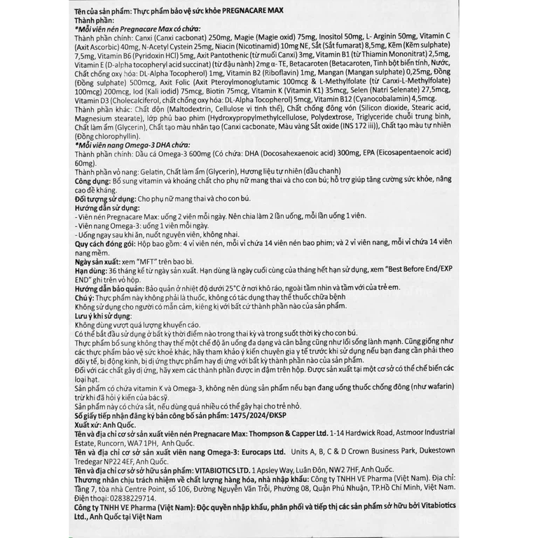 Pregnacare Max bổ sung vitamin và khoáng chất cho phụ nữ mang thai và cho con bú; hỗ trợ giúp tăng cường sức khỏe, nâng cao đề kháng.