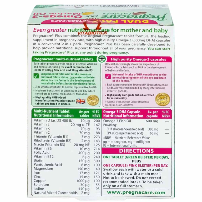 Pregnacare Plus Omega-3 bổ sung vitamin và khoáng chất cho phụ nữ mang thai và cho con bú.