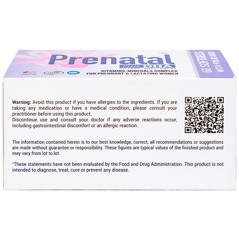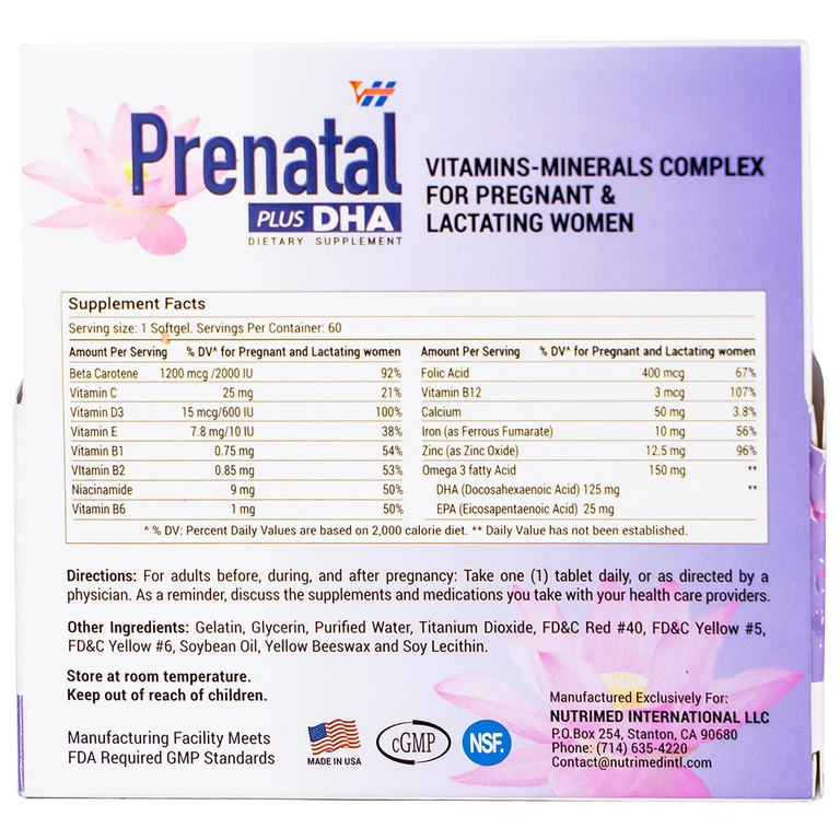 Prenatal Plus DHA Nutrimed sản xuất tại Mỹ. Sản phẩm có cơ sở sản xuất đáp ứng tiêu chuẩn GMP theo FDA Hoa Kỳ, đạt chất lượng theo tiêu chuẩn NSF. do WHO chứng nhận.