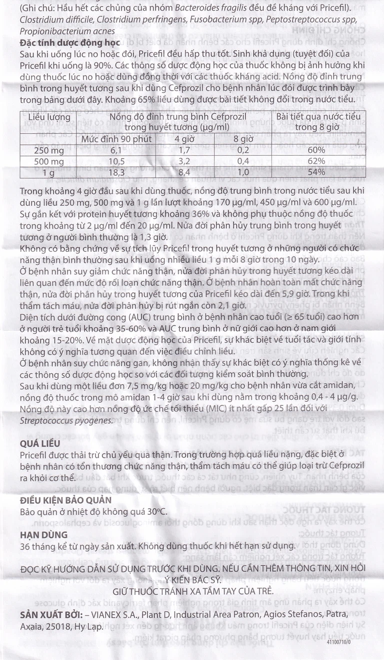Sau khi uống lúc no hoặc đói, Pricefil 500mg đều hấp thu tốt. Sinh khả dụng (tuyệt đối) của Pricefil 500mg khi uống là 90%. Các thông số dược động học của thuốc không bị ảnh hưởng khi dùng thuốc lúc no hoặc dùng đồng thời với các thuốc kháng acid. Nồng độ đỉnh trung bình trong huyết tương sau khi dùng Cefprozil cho bệnh nhân lúc đói được trình bày trong bảng dưới đây. Khoảng 65% liều dùng được bài tiết không đổi trong nước tiểu.