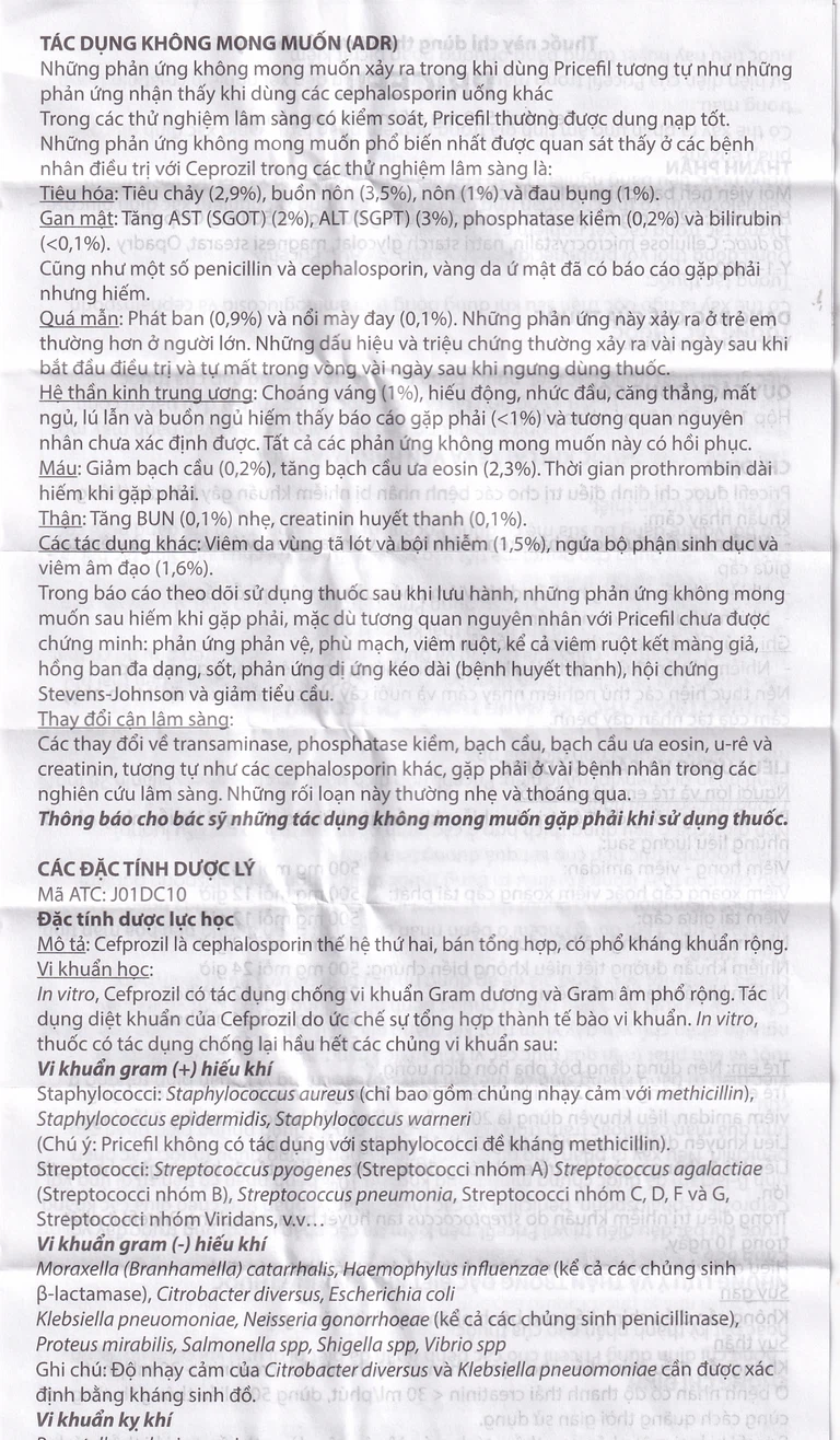 Trong các thử nghiệm lâm sàng có kiểm soát, Pricefil thường được dung nạp tốt. Những phản ứng không mong muốn phổ biến nhất được quan sát thấy ở các bệnh nhân điều trị với Ceprozil trong các thử nghiệm lâm sàng là: