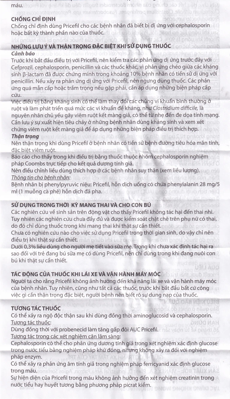 Nên thận trọng khi dùng Pricefl 500mg ở bệnh nhân có tiền sử bệnh đường tiêu hóa mãn tính, đặc biệt viêm ruột. Hai báo cáo cho thấy trong khi điều trị bằng thuốc thuộc nhóm cephalosporin nghiệm pháp Coombs trực tiếp cho kết quả dương tính giả.