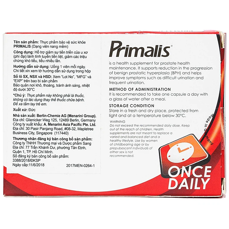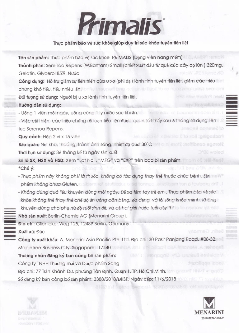Primalis có nguồn gốc từ Đức, chịu trách nhiệm sản xuất bởi Berlin-Chemie AG (Menarini Group). Primalis là thực phẩm chức năng bảo vệ tuyến tiền liệt hàng đầu Châu Âu, đã có mặt hơn 20 năm trên thị trường với tên gọi Prostamol, được khách hàng trên toàn thế giới tin dùng. Năm 2018, Primalis có mặt tại thị trường Việt Nam và được rộng rãi các bác sĩ, dược sĩ khuyên dùng.