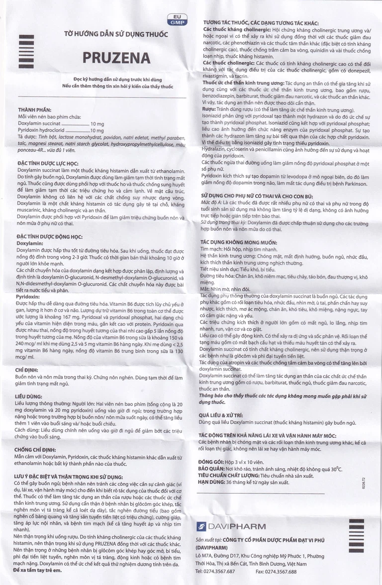 Do tính kháng cholinergic của các thuốc kháng histamin, nên thận trọng khi sử dụng Pruzena đồng thời với các thuốc khác. Nên thận trọng ở những bệnh nhân bị glôcôm góc khép hay góc mở, bí tiểu, phì đại tiền liệt tuyến, nghẽn môn vị tá tràng, động kinh hoặc có bệnh tim mạch nặng. Doxylamin có thể ức chế kết quả thử nghiệm dương tính trên da.