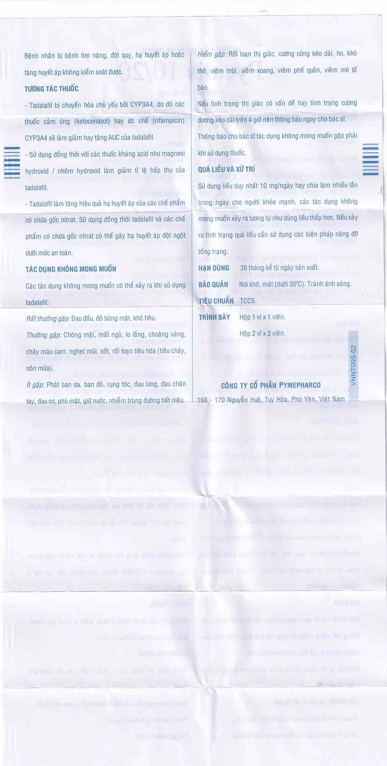 Thời gian đáp ứng của thuốc từ 30 – 60 phút sau khi uống. Thời gian tác dụng của thuốc có thể lên đến 36 giờ. Để thuốc có tác dụng cần phải có sự kích thích hay sự ham muốn về tình dục.