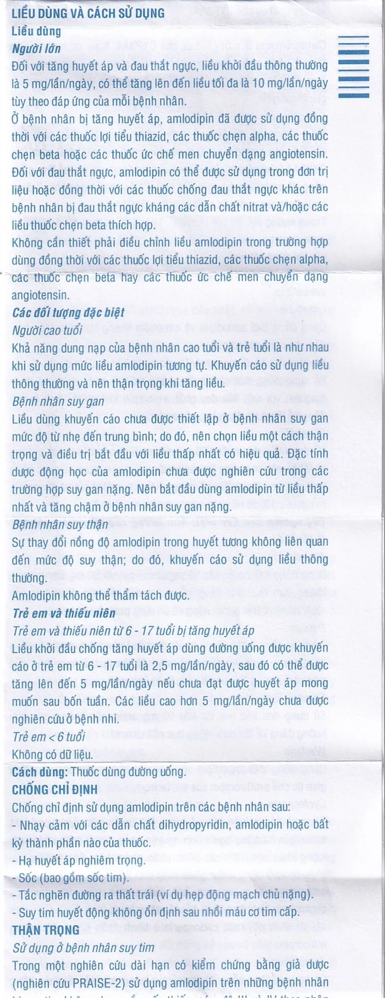Người cao tuổi: Khả năng dung nạp của bệnh nhân cao tuổi và trẻ tuổi là như nhau khi sử dụng mức liều amlodipin tương tự. Khuyến cáo sử dụng liều thông thường và nên thận trọng khi tăng liều.