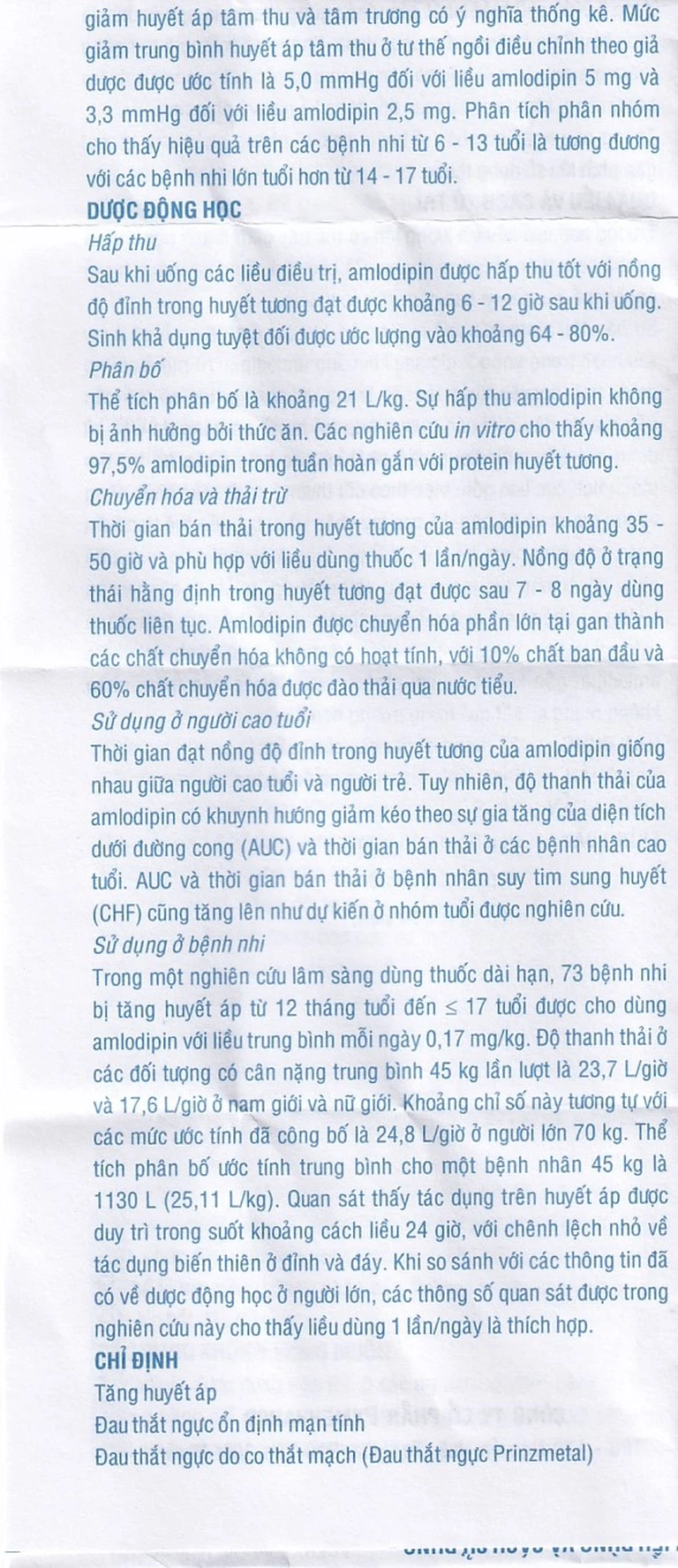 Trẻ em và thiếu niên từ 6 – 17 tuổi bị tăng huyết áp Liều khởi đầu chống tăng huyết áp dùng đường uống được khuyến cáo ở trẻ em từ 6 – 17 tuổi là 2,5 mg/lần/ngày, sau đó có thể được tăng lên đến 5 mg/lần/ngày nếu chưa đạt được huyết áp mong muốn sau bốn tuần. Các liều cao hơn 5 mg/lần/ngày chưa được nghiên cứu ở bệnh nhi.