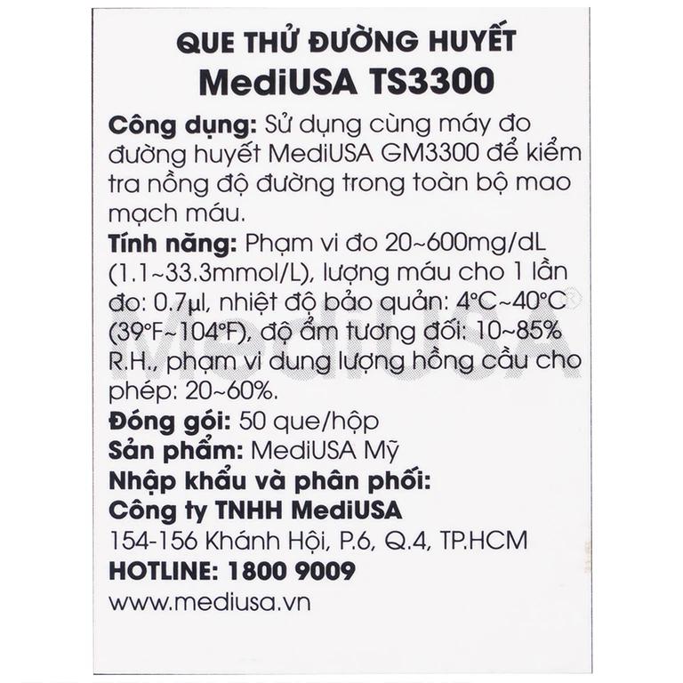 Que thử đường huyết MediUSA TS3300 được sản xuất bởi MediUSA, Mỹ. MediUSA là thương hiệu chuyên nhập khẩu, phân phối các sản phẩm bảo vệ sức khỏe, thiết bị y tế cá nhân, máy đo huyết áp, máy đo đường huyết, máy đo thân nhiệt đến từ Mỹ. Tất cả sản phẩm của MediUSA đều được thiết kế bởi Cục R&D, C&A, sản xuất theo tiêu chuẩn ISO 9001 và tiêu chuẩn ISO 13485-2003, đạt tiêu chuẩn liên minh Châu Âu CE số 0336; được Cục quản lý Thực phẩm và Dược phẩm Hoa Kỳ phê chuẩn cũng như đạt tiêu chuẩn của Hiệp hội Y khoa Thế giới.