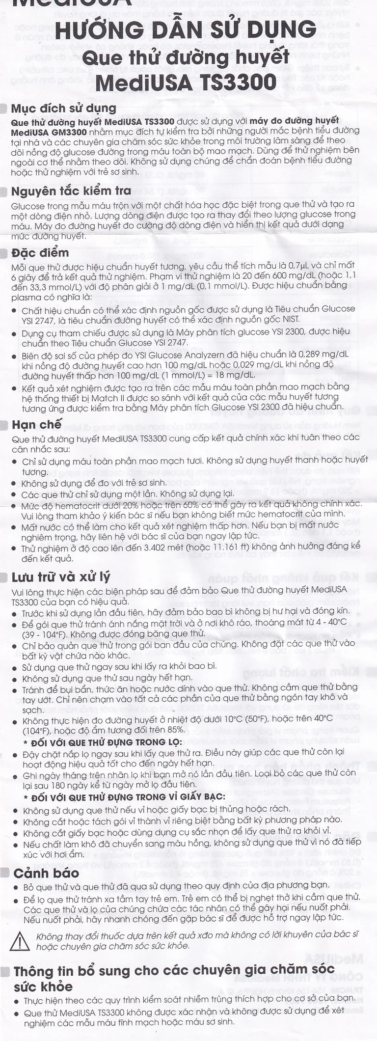 Nếu bạn cần tìm kiếm loại que thử đường huyết thay thế khi sản phẩm cũ đã hết, bị hư, hỏng,… thì que thử đường huyết MediUSA TS3300 là một gợi ý tốt mà bạn có thể tham khảo. Que thử đường huyết MediUSA TS3300 giúp bạn xác định được chỉ số đường huyết ở thời điểm hiện tại, đảm bảo độ chính xác, giúp cho kết quả nhanh chóng và an toàn.